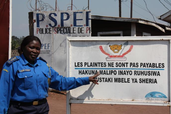 « Nous avons les meilleurs officiers de police judiciaire de la police nationale du Congo. Les gens font des kilomètres pour venir se plaindre, gratuitement, ici », affirme fièrement le colonel Marie Bagalet. Dans la cour, un auvent a été construit où des dizaines de personnes attendent à l’abri du soleil. « Nous sommes presque les seuls à avoir quatre cellules aux normes », poursuit-elle. Mais ce matin de juin, les cellules sont vides. La fosse septique est bouchée, il n’y a pas d’eau. L’odeur est trop forte pour laisser les prisonniers enfermés dans une des cellules sans ouverture, et d’où les paillasses ont disparu lors d’un pillage en 2012. Le colonel attend que les Nations unies envoient le plombier.